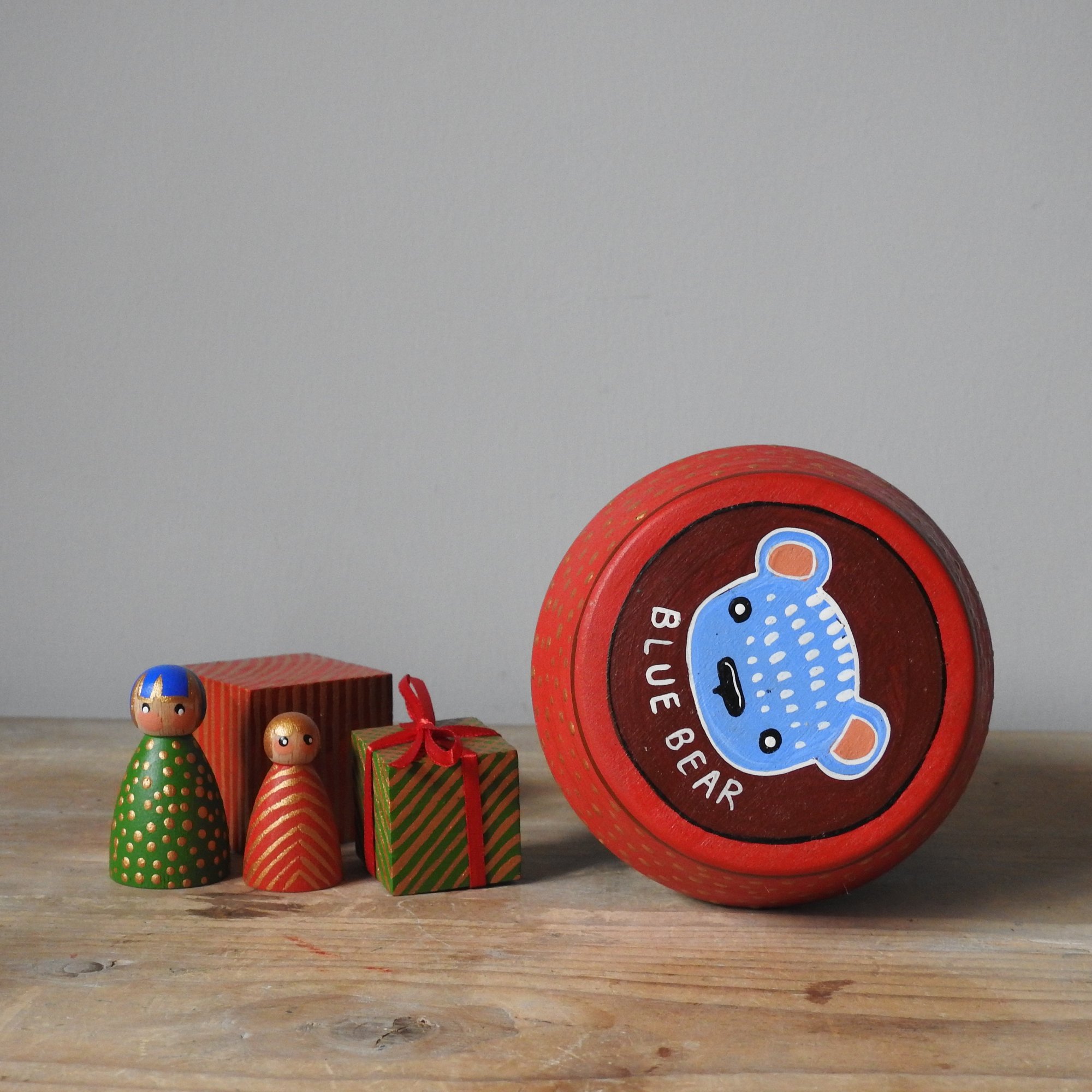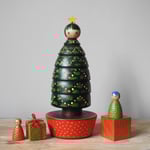 A large wood girl getting into the festive spirit by dressing up as a Christmas tree. 'Planted' in a red pot with gold dots, she also comes with two little wooden 'gifts' and a two tiny wood girl friends.