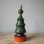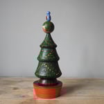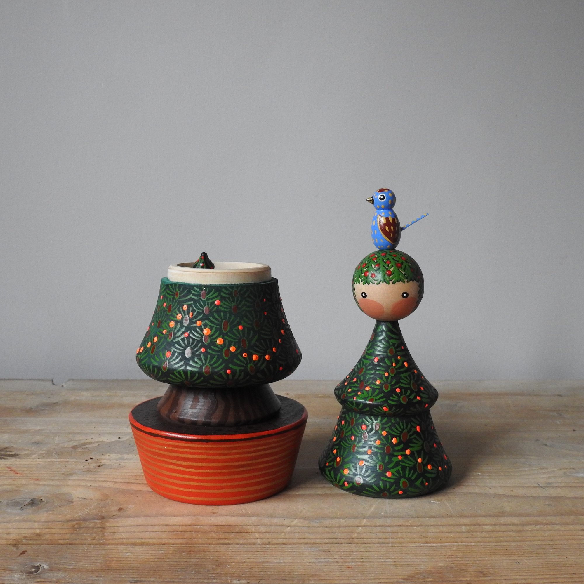 A large christmas tree girl with a hidden surprise - grasp the body of the tree firmly in both hands and twist at the middle and you will find some cute little surprises - three teeny christmas trees and three little wood girls. Perched at the top of the tree is a fancy blue bird friend.