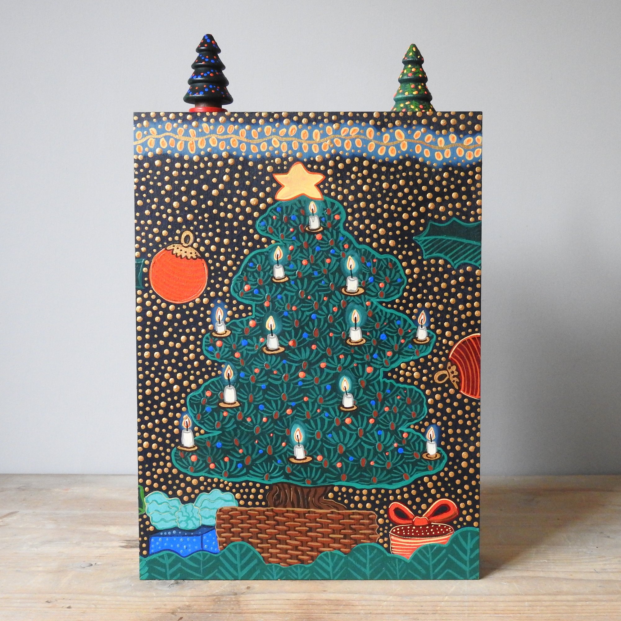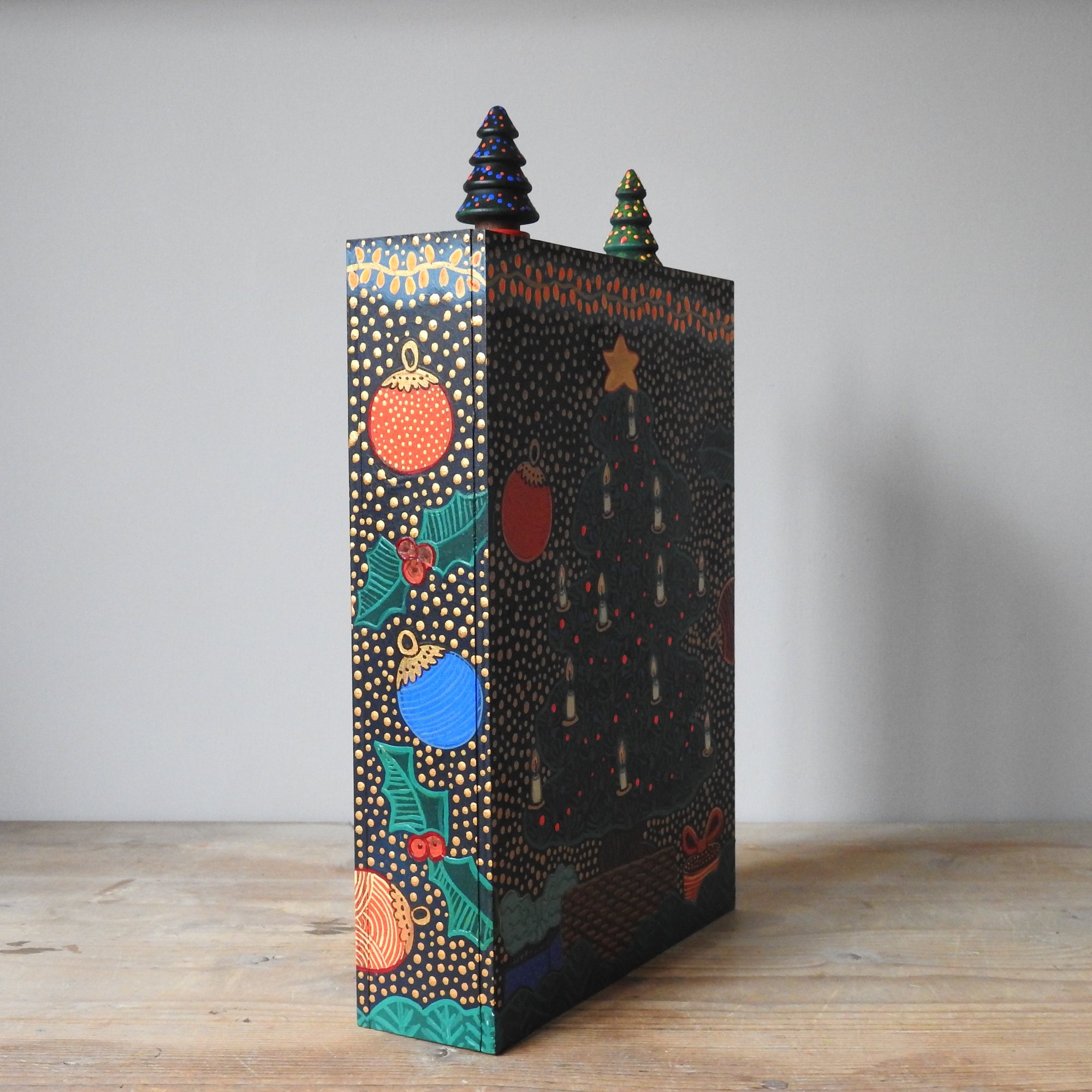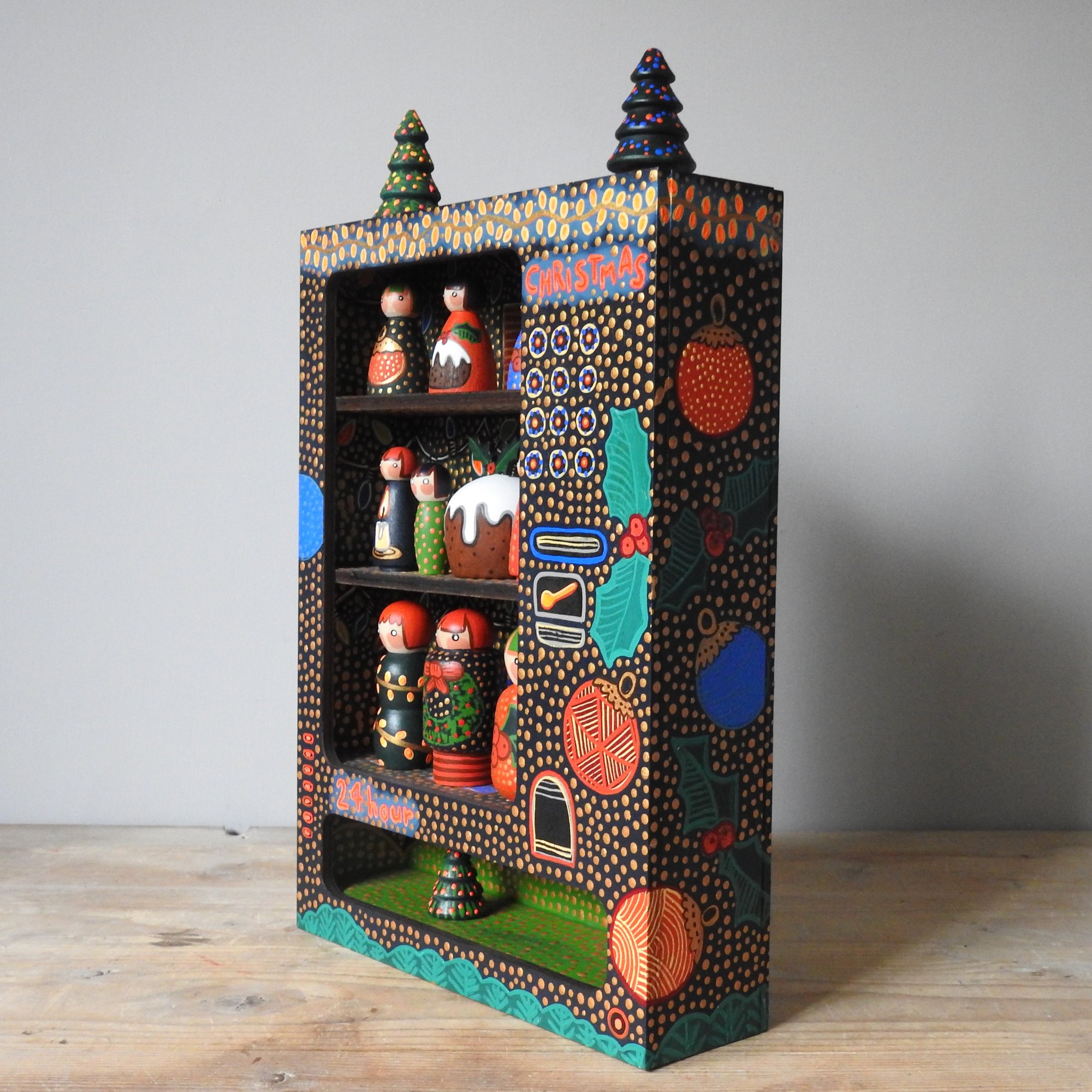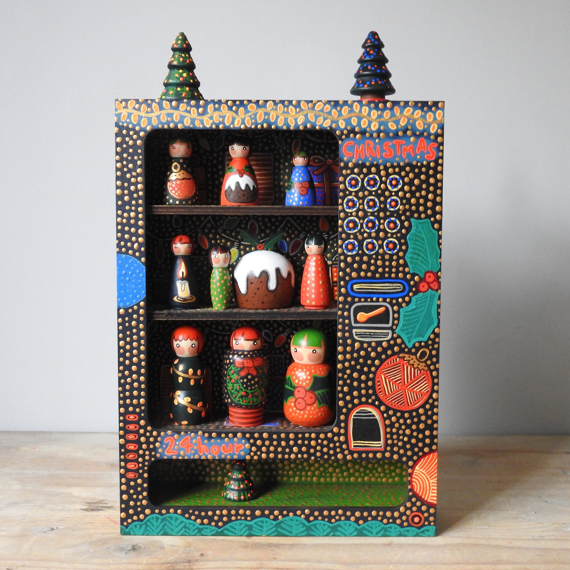 The machine comes fully 'stocked' with nine tiny wood girls in festive dresses, three tiny Christmas trees and a little wooden Christmas pudding that I loved making!