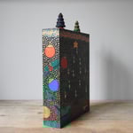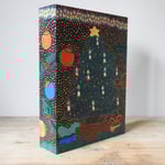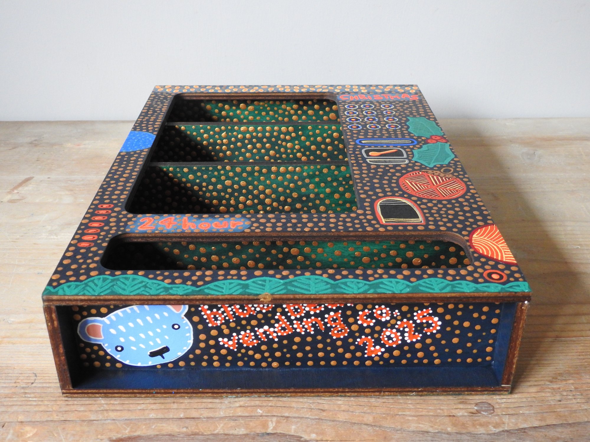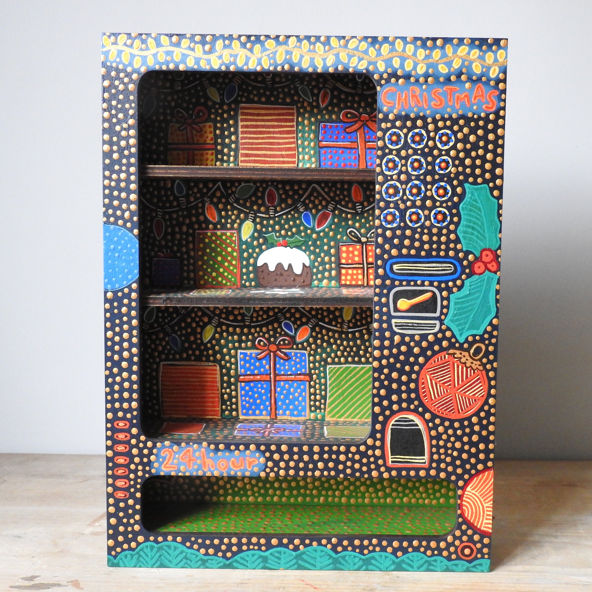 A vending machine really going for the festive 'more is more' look! The interior has gifts and fairy lights and the outside has a large tree on the back, baubles, holly sprigs and a riot of gold dots - completely over the top visually as the festive season sometimes is.