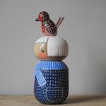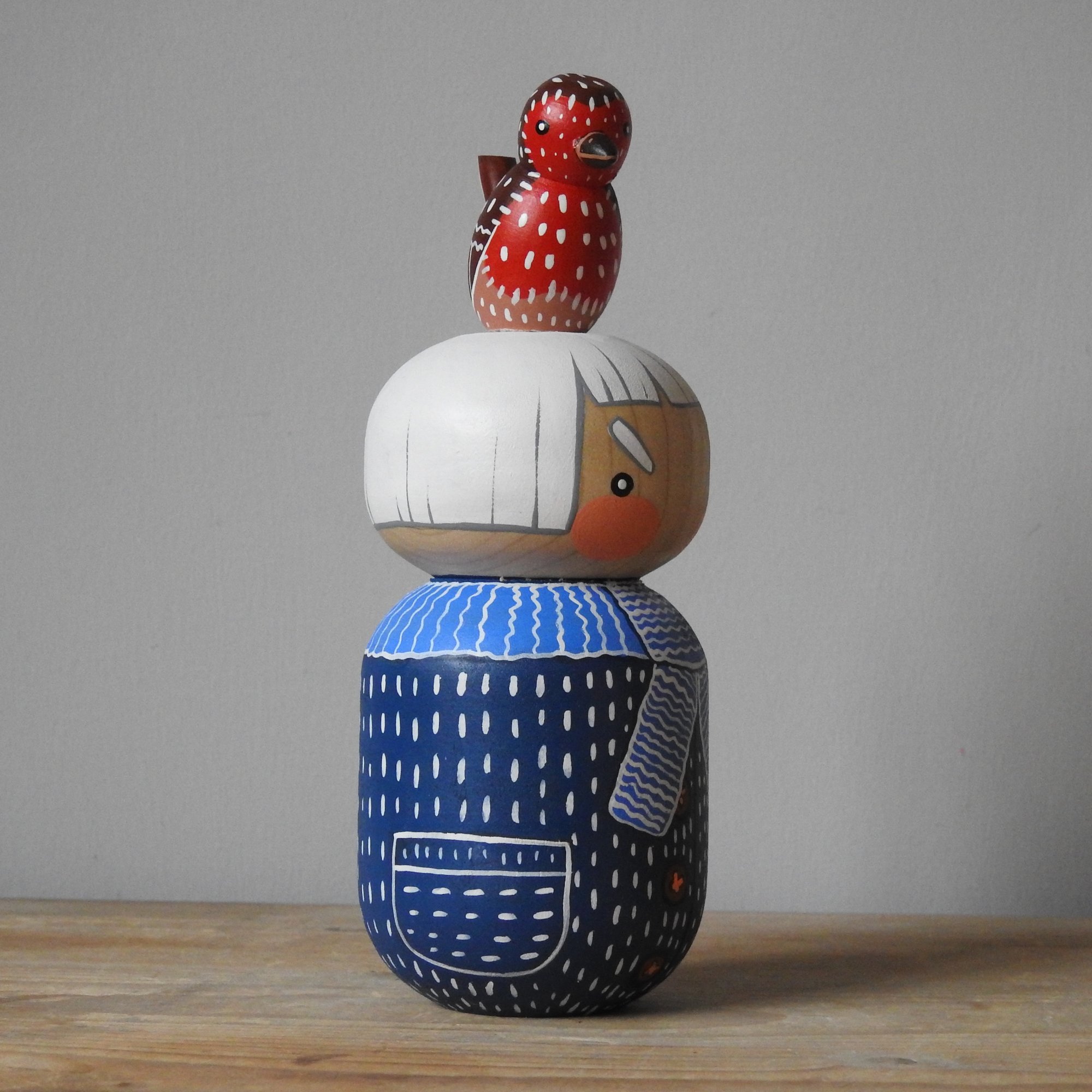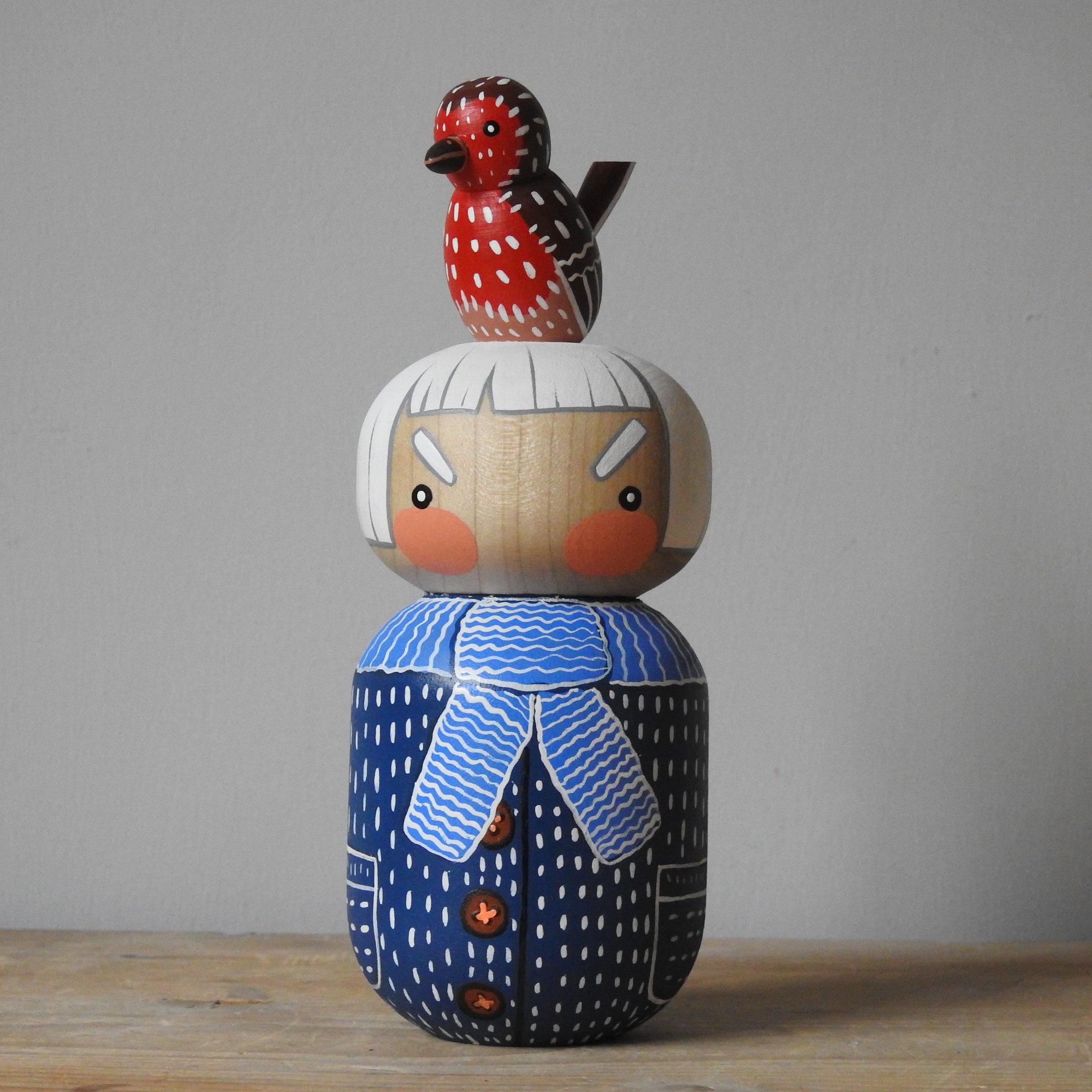 A wood girl who is just cross at the moment - even though a robin redbreast has landed on her head and she has a lovely blue coat an scarf.