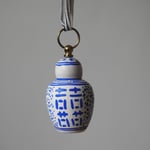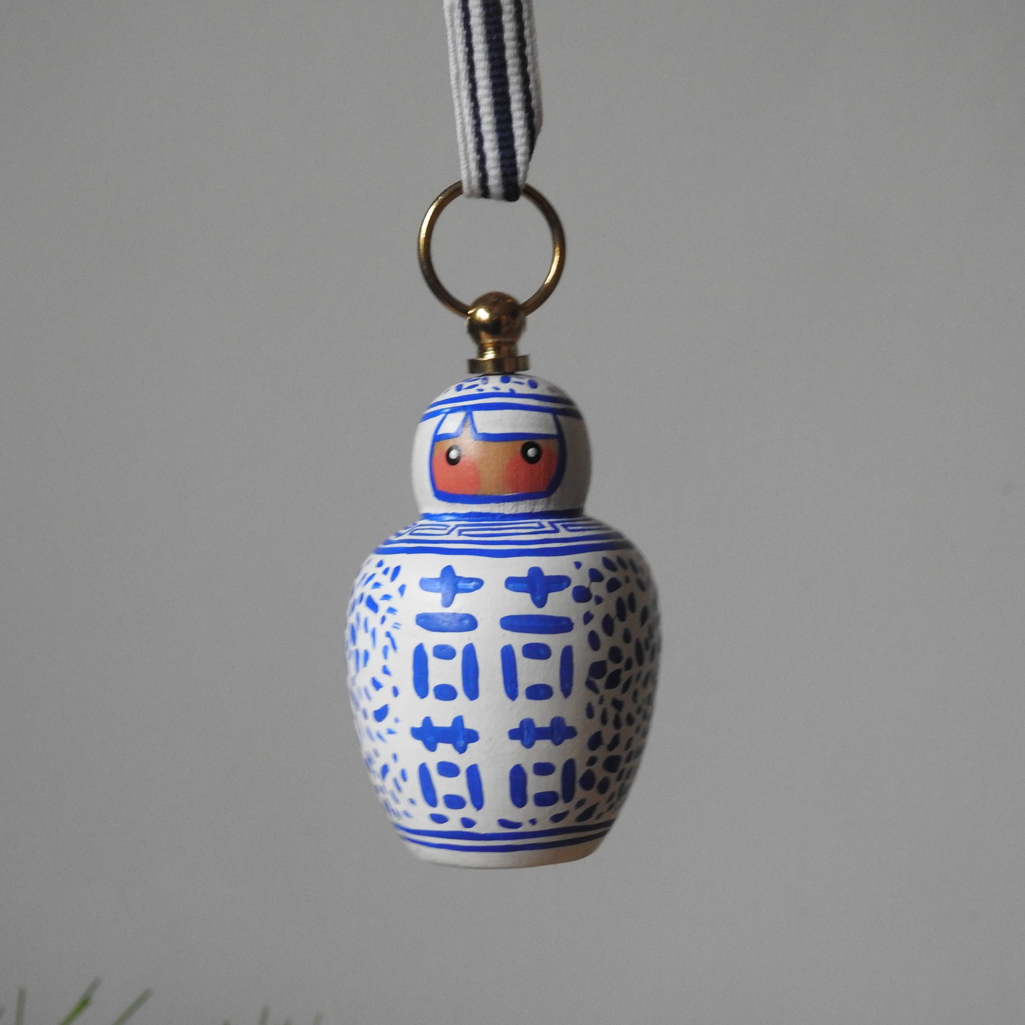 This little wood girl has gone and dressed up as a blue and white 'Double Happiness' Chinese Ginger Jar - complete with a brass hanging ring, ready to hang up.