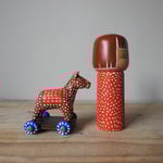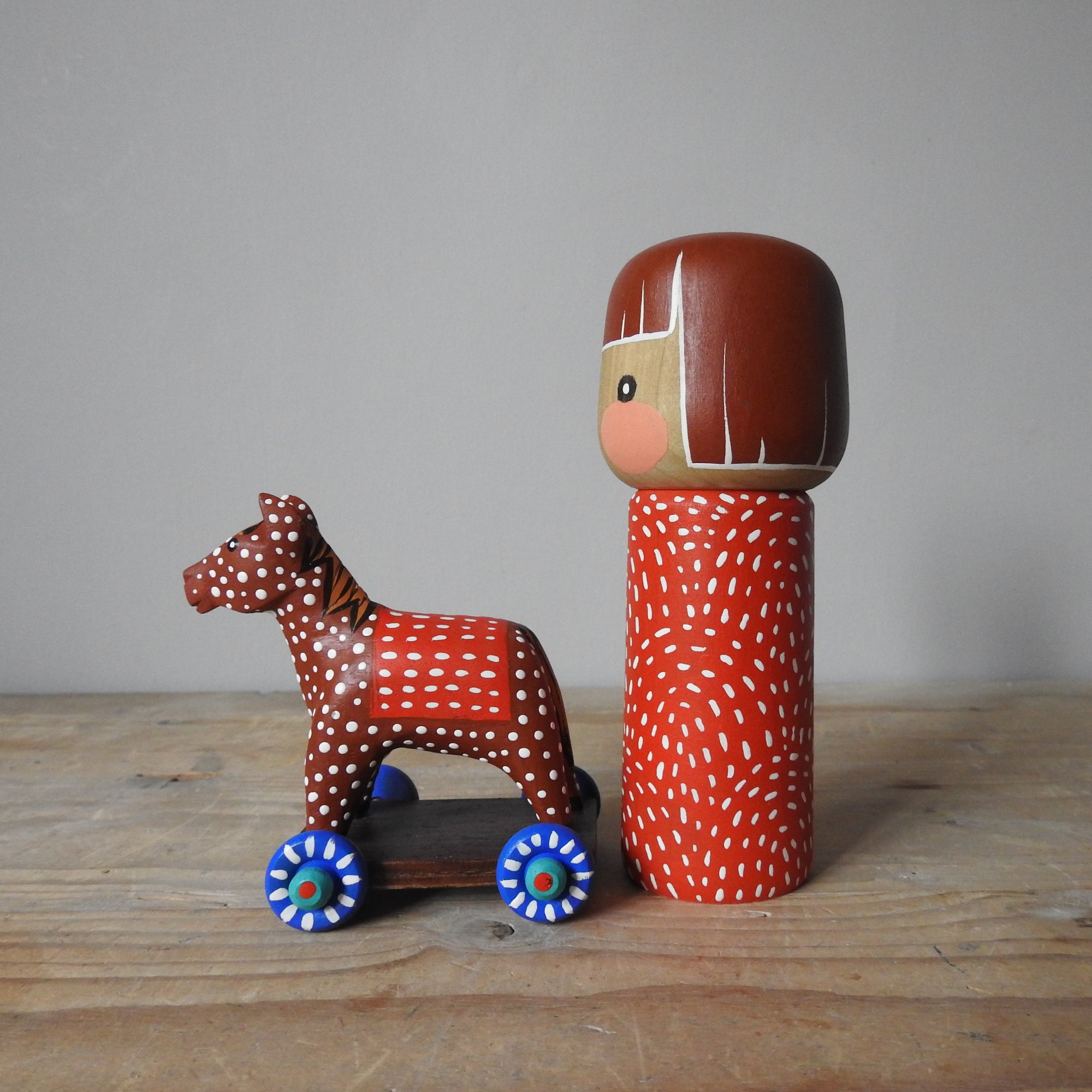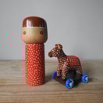 Made to mark the Year of the Horse in 2026, this wood girl is dressed in a dotty patterned dress and is playing with her toy wheel-along horsey.