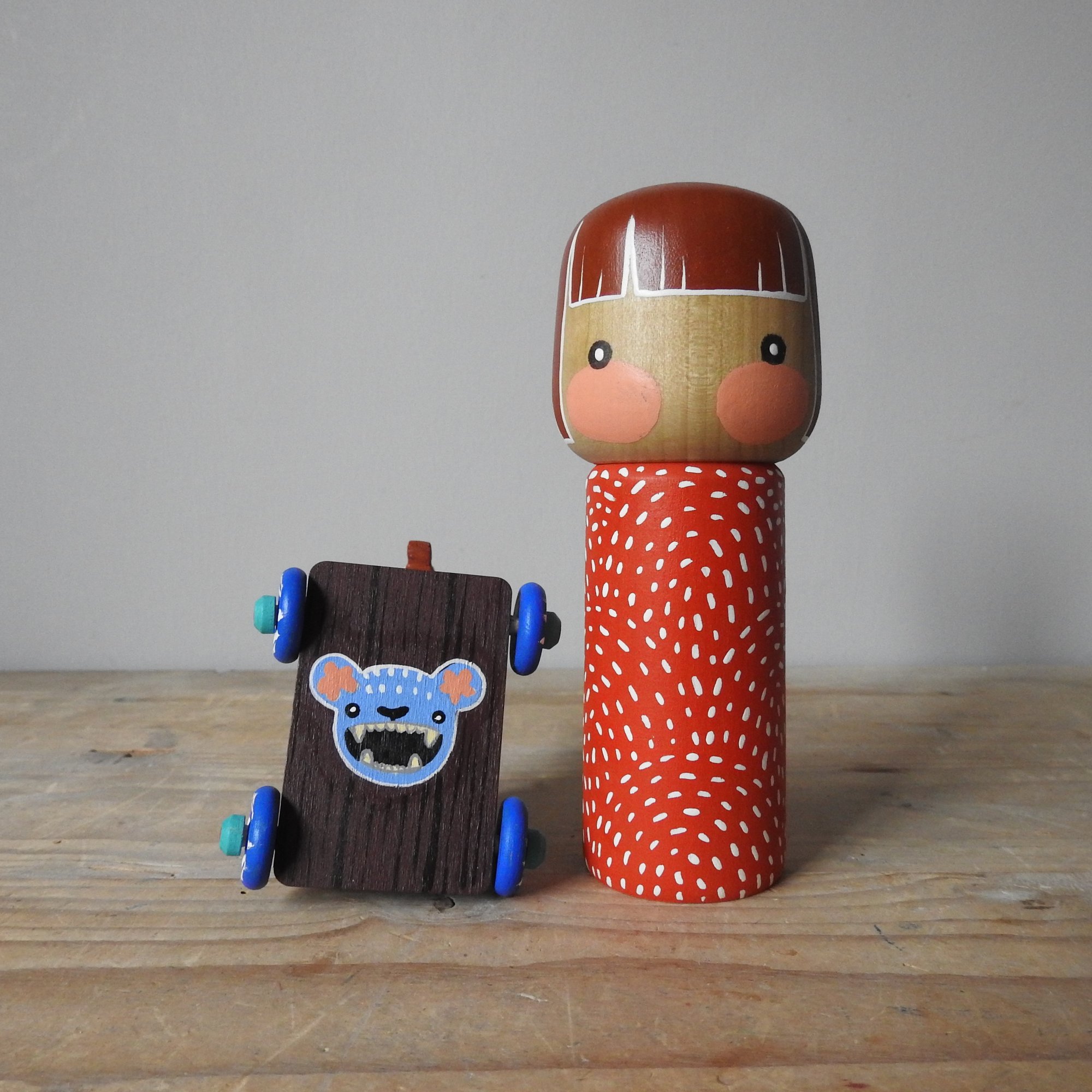 My pieces are painted in a naïve and simple style, with visible brush strokes and differing paint consistencies. It is important to note that these dolls are made from real wood which will have naturally occurring markings and grain, and sometimes there will be small amount of bleeding along the grain, or knots, which is to be expected when using untreated wood - please make sure you consult the pictures carefully before purchasing. She has been finished in a top coat of matt acrylic.