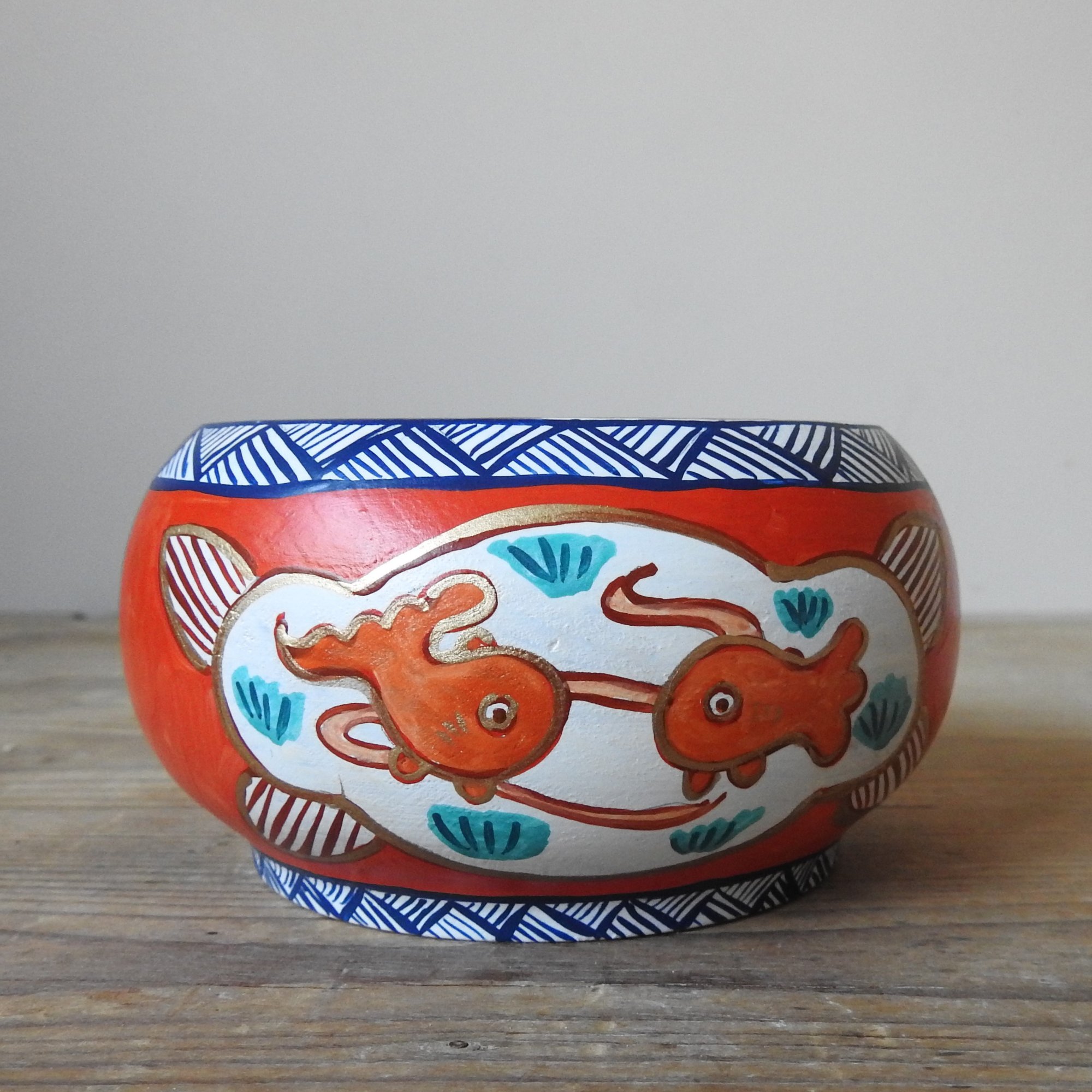 My pieces are painted in a naïve and simple style, with visible brush strokes and differing paint consistencies. It is important to note that these pieces are made from real wood which will have naturally occurring markings and grain, and sometimes there will be small amount of bleeding along the grain, or knots, which is to be expected when using untreated wood - please make sure you consult the pictures carefully before purchasing. The piece has been finished in a top coat of matt acrylic.