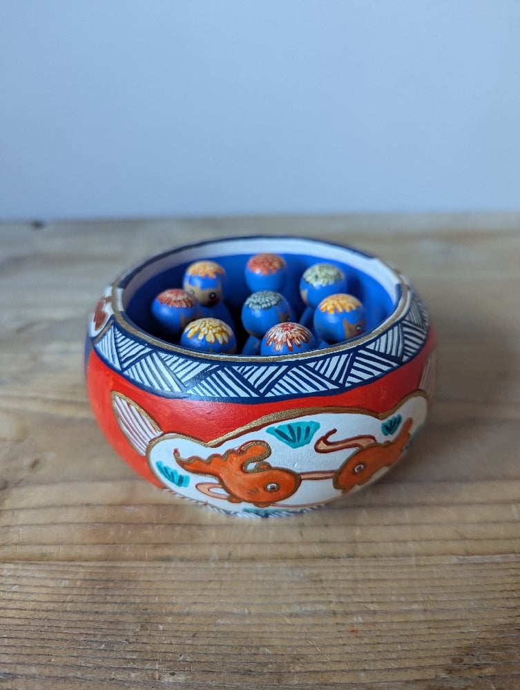 A mini wood girl set inspired partly by the Japanese 'hanachozu' or flower basins, where basins for purification at the entrances to shrines and temples have been filled with cut flower heads - sometimes just as decorations or as part of town-wide displays, but they were also used during the Covid19 pandemic to prevent people from scooping water and spreading the disease. This is a reimagined version, set inside an Imari style pattern 'ceramic' bowl instead of a stone basin.