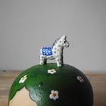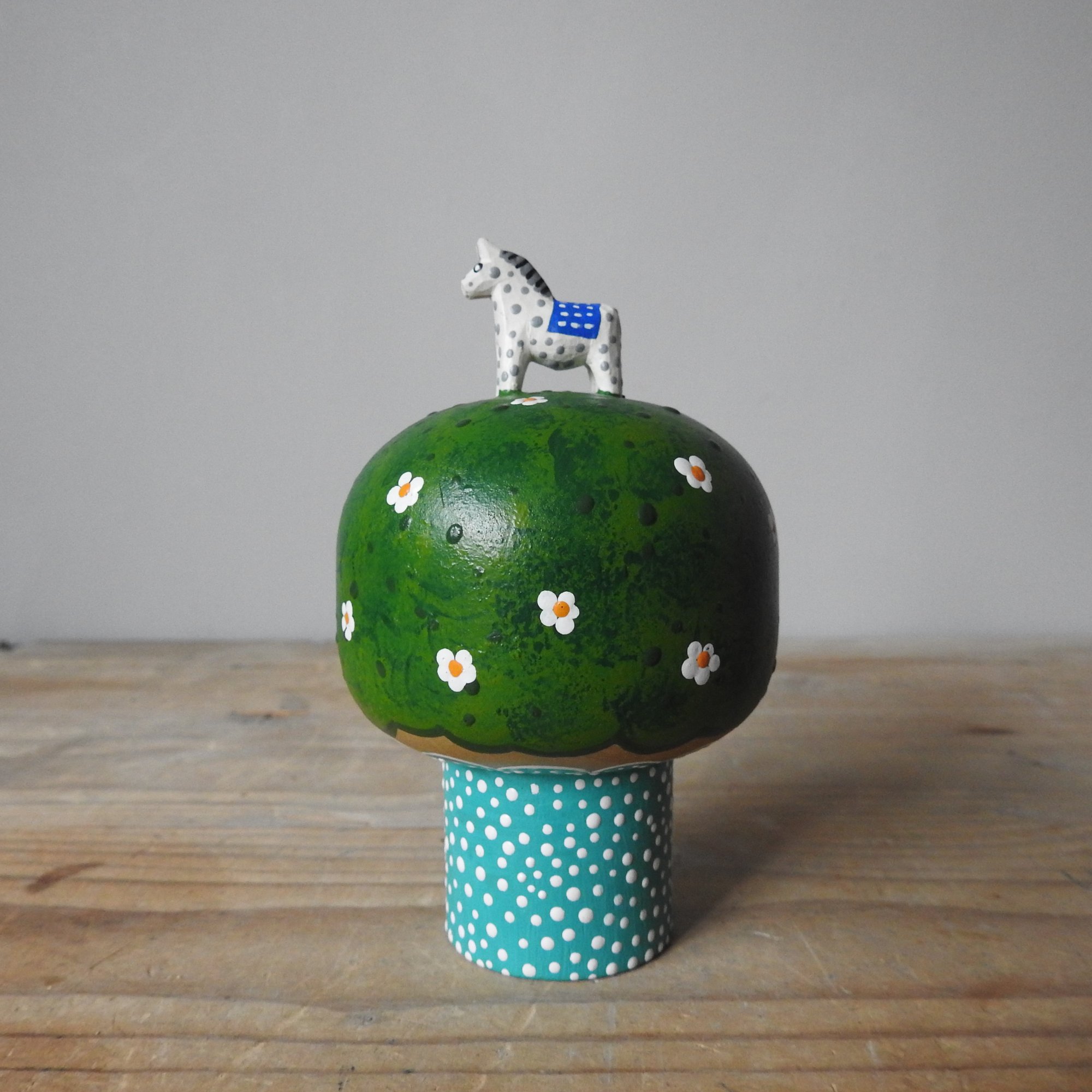 Turned from American Tulipwood, a sustainably managed timber, my pieces are turned on a lathe by a production wood turner in the UK to my designs, then added to and painted by me, a British artist. She has had a pine miniature dala horse added, then has been hand painted and finished in a matt acrylic protective top coat. The artist signature is a painted bear head on the base.