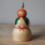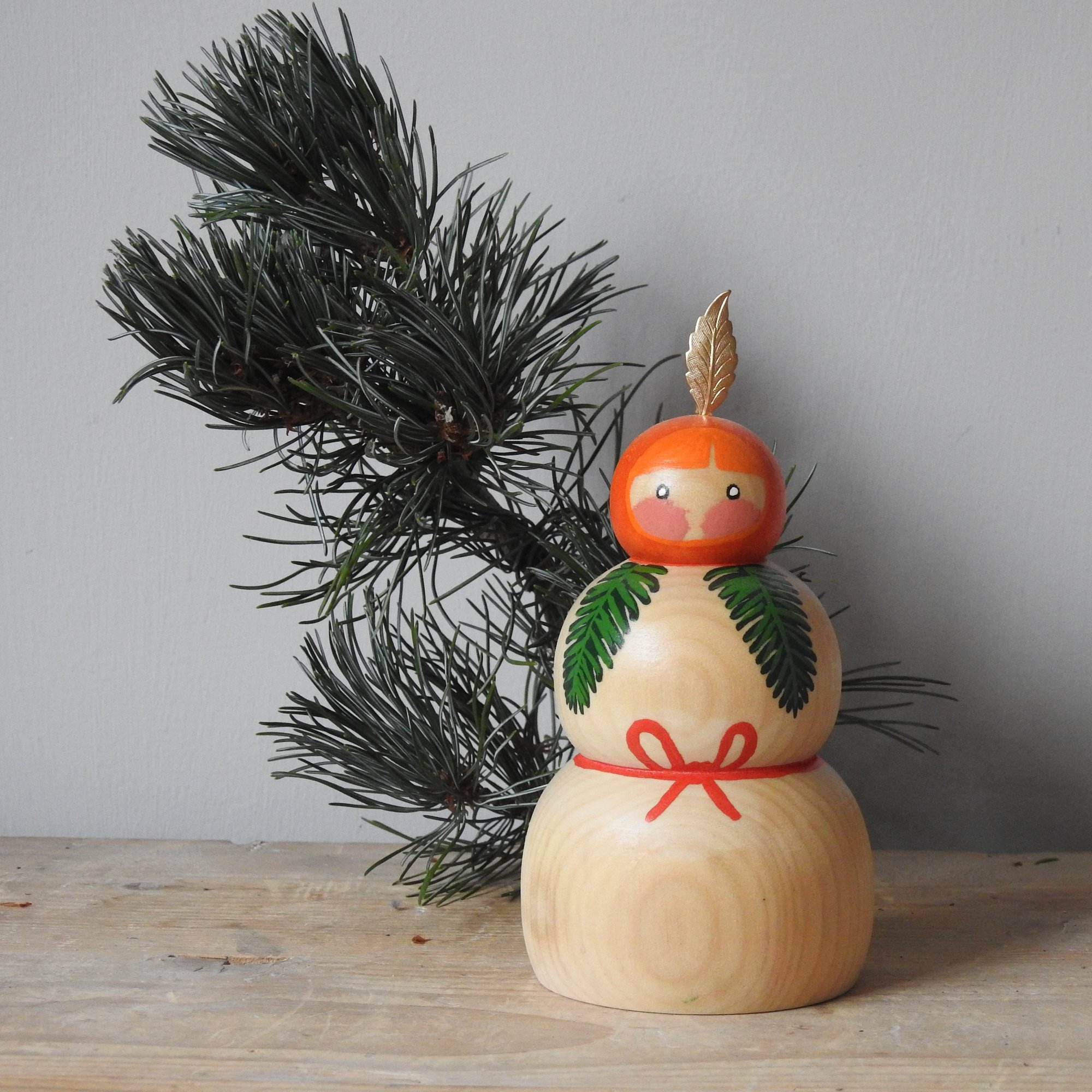 This turned Tulipwood girl is posing as a special offering known as a Kagami Mochi (鏡餅), a New Year decoration made from two round mochi rice cakes, a larger one on the bottom, then a smaller one, and a daidai Japanese orange placed on the top. She has a delicate brass leaf pair in her hat, and her wood grain has been left unpainted to share the natural beauty of the wood. According to Shinto custom, these should be placed in several locations around the house from the 1st January to the day of 'kagami biraki'.