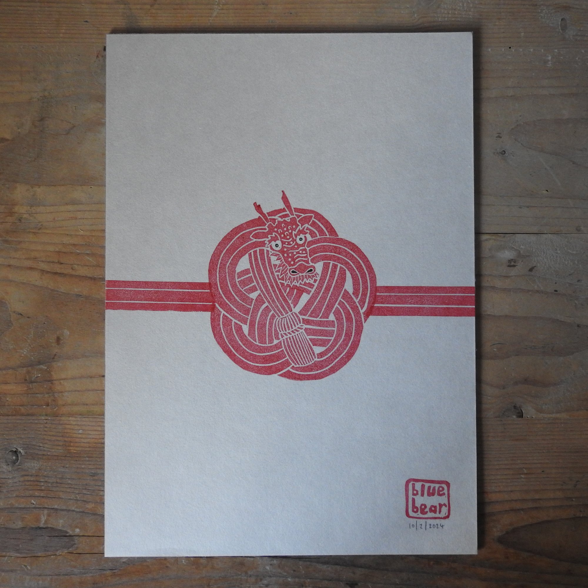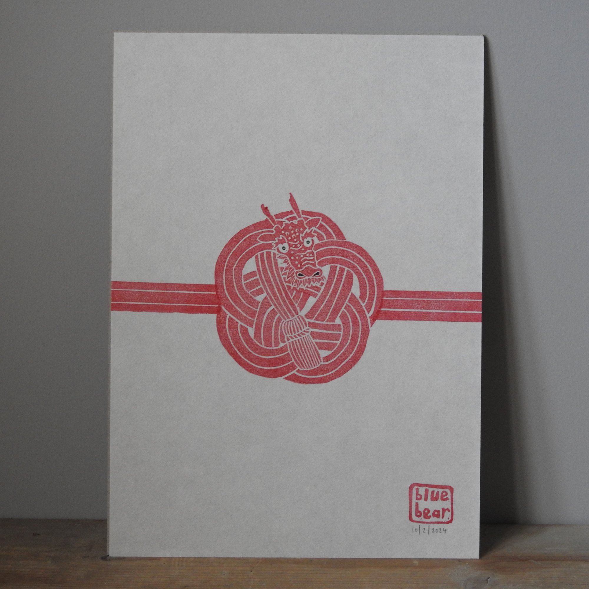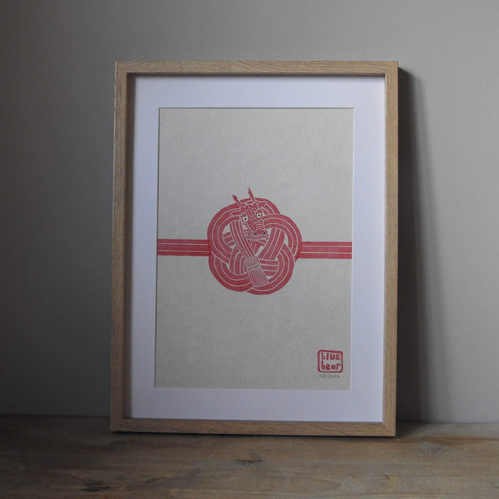 Individually hand printed from a carved rubber printing block in a red Japanese pigment ink. Each print will have natural small variations, due to the methods used - the one you receive may not be exactly the same as the one shown in the photographs. Comes unframed. If you are framing and using the supplied grey backing board, you can insert a sheet of white A4 paper between the print and board to improve the brightness of the paper.