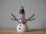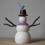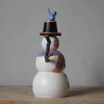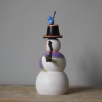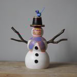 A wood girl having winter fun dressed up as a snow-girl - with her top hat and knitted scarf she's feeling the part - and a little blue bird has come to say hello.