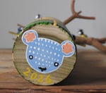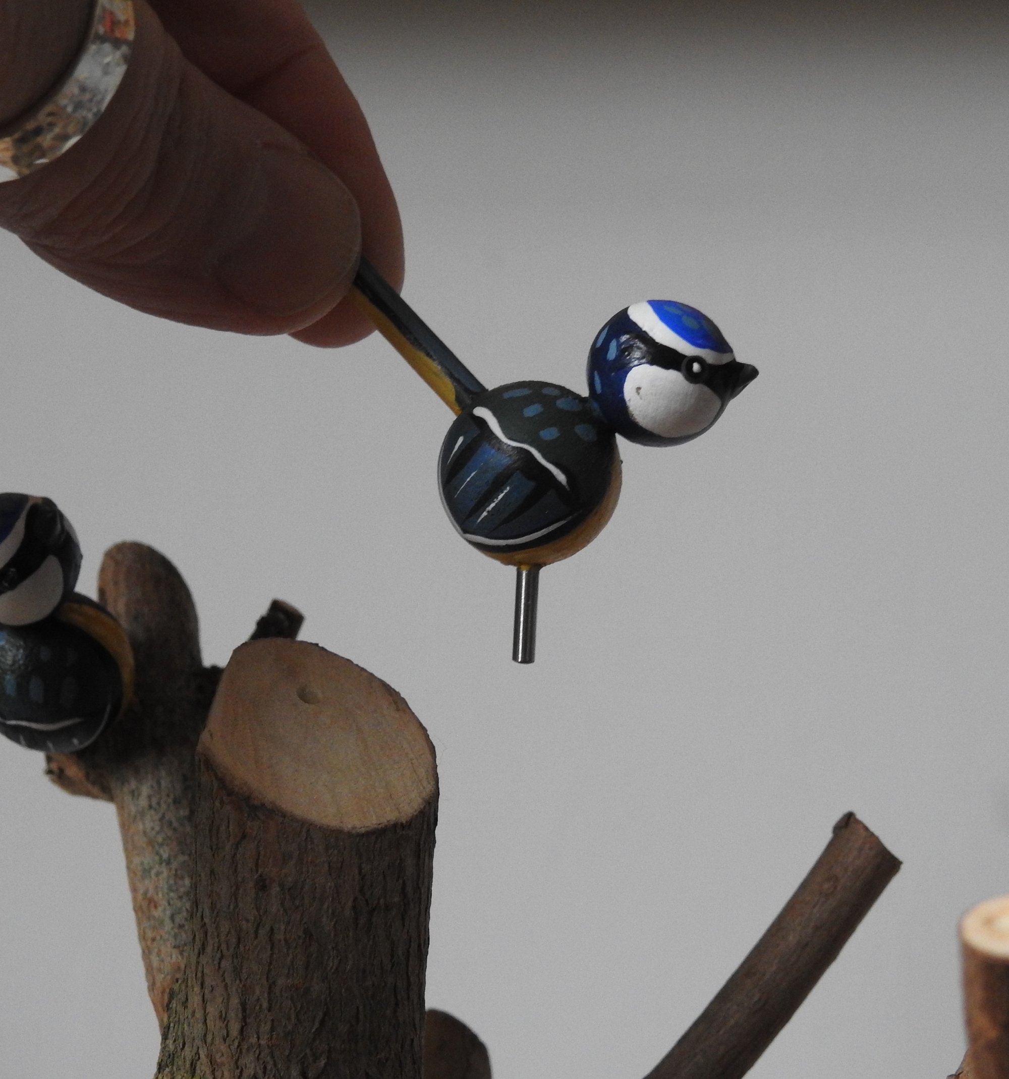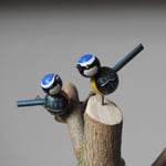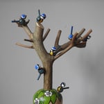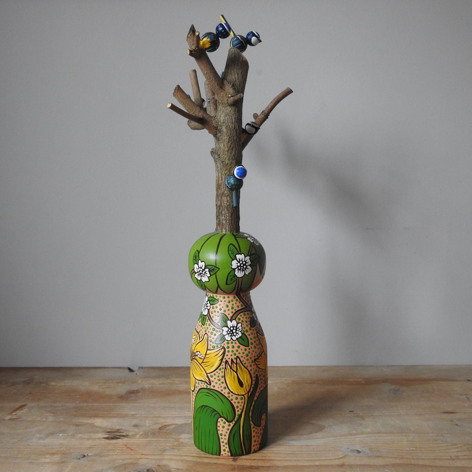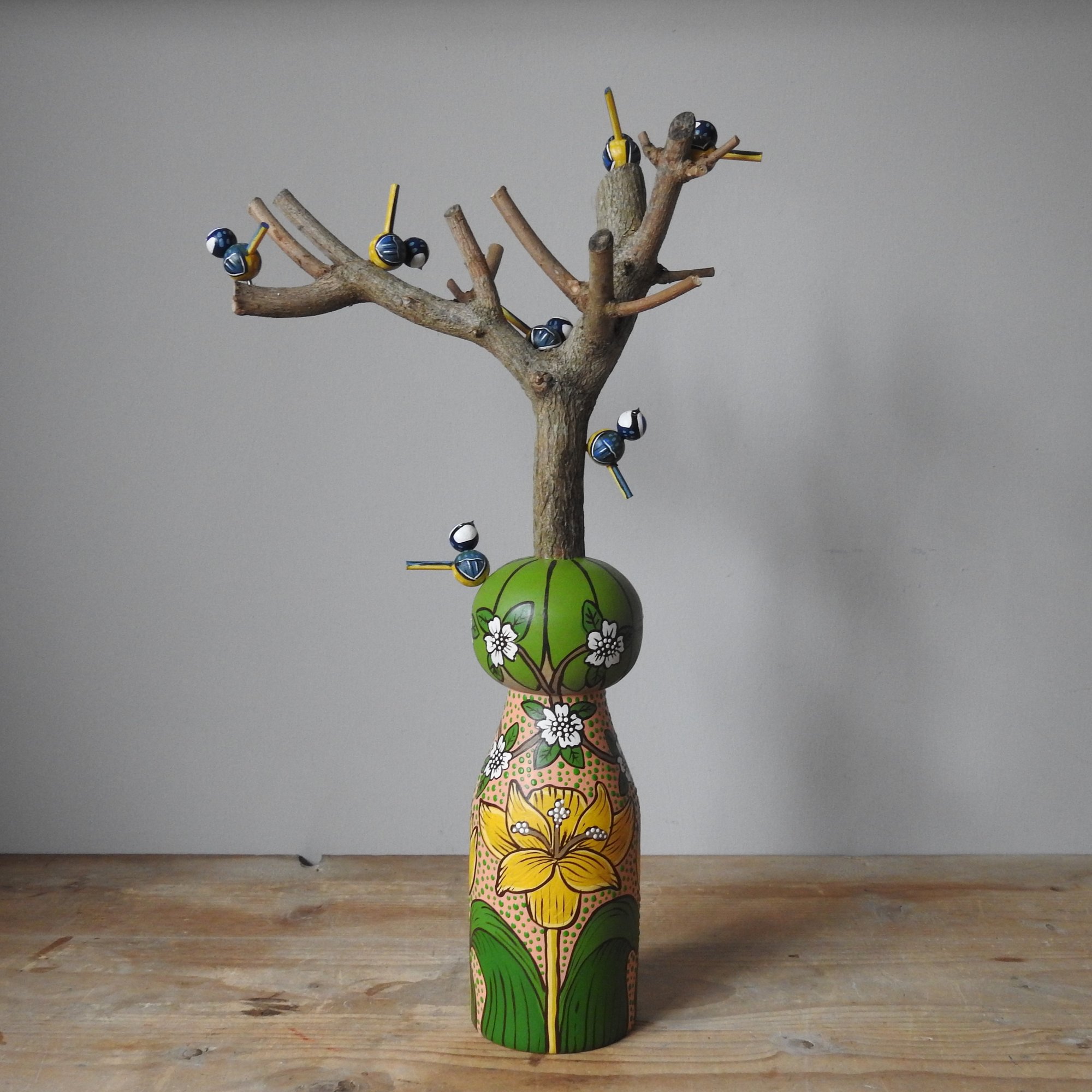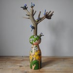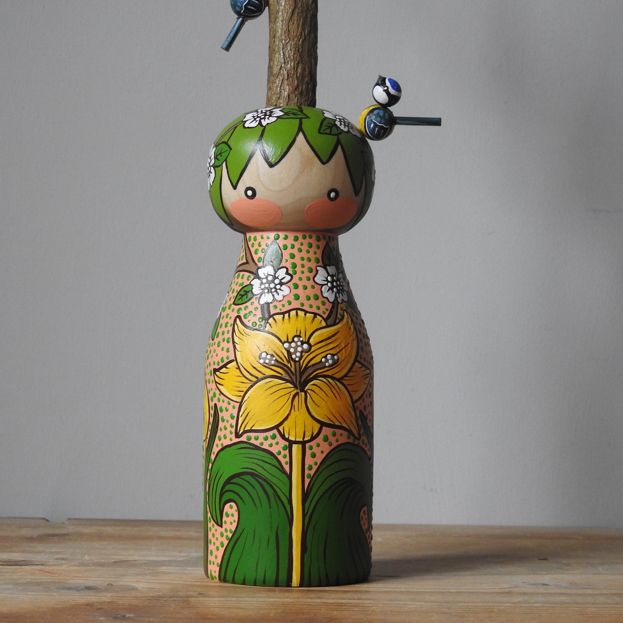 This fabulously flamboyant large wood girl was inspired by the 'spring thicket' design by William Morris - the exuberance of spring when everything starts to go mad is perfectly pictured in the design, with bulb flowers and blackthorn style blossoms - with my signature dots added for this girl's dress. On her head she is wearing a large piece of pruned tree from our garden that is the home to seven tiny blue tits. Blue tits travel in family flocks and often perform acrobatic feats to get the insects they have spied on tree branches. (Note: to prevent breakage, the little birds come on a small metal pins that locate in small holes on the branches as pictured, to be attached carefully when unpacked).