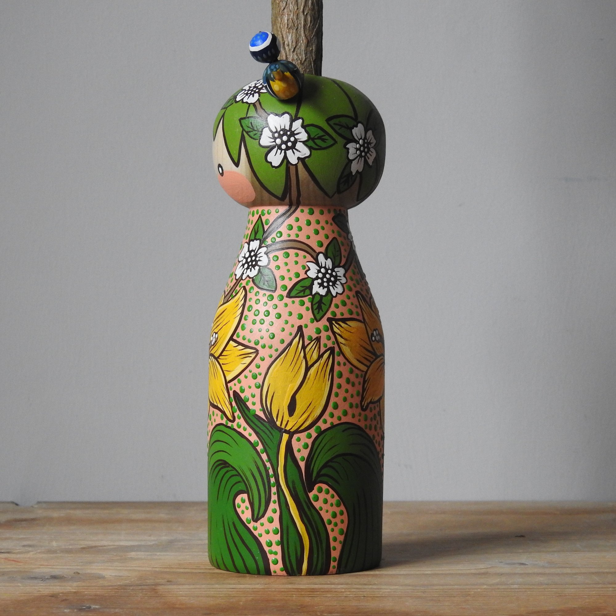 My pieces are painted in a naïve and simple style, with visible brush strokes and differing paint consistencies. It is important to note that these dolls are made from real wood which will have naturally occurring markings and grain, and sometimes there will be small amount of bleeding along the grain, or knots, which is to be expected when using untreated wood - please make sure you consult the pictures carefully before purchasing. She has been finished in a top coat of matt acrylic.