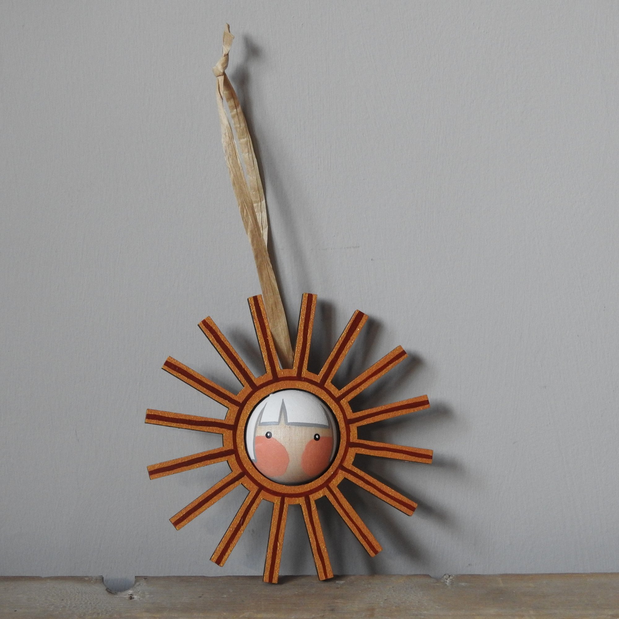 A much needed sight in winter - a sunburst - in the form of a rosy-cheeked wood girl face at the centre of a golden burst - ready to hang up.