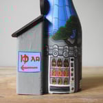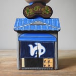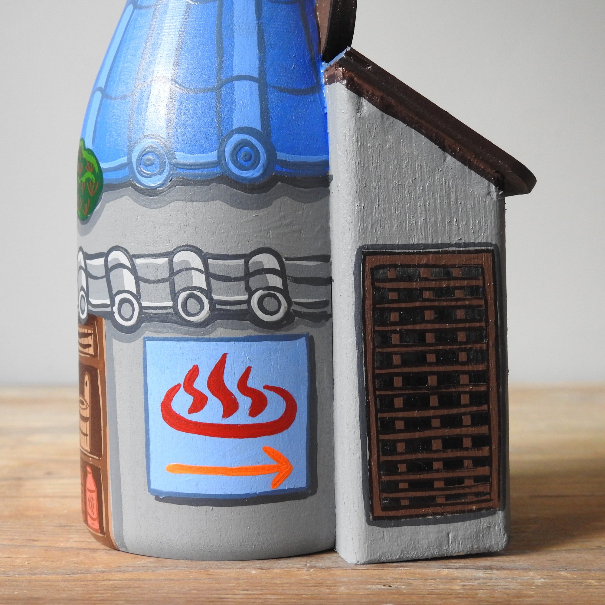 Under a pretty blue tiled and rustic wooden roof you can enter the store by passing under the bathhouse style noren with the 'yu' character for hot water. Stroll around the back of the sento for more signage, a vending machine selling strawberry milk and milk coffee and a wooden storage unit housing ladles and buckets, towels and shampoo. Before entering the sento, patrons can marvel at the traditional sento chimney coming out of the wood girls head (blue tiled again) - complete with a blue bird perched on the top. The store part is made from offcuts of timber and so will have a slightly rough texture - all adding to the feel of an old building.
