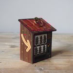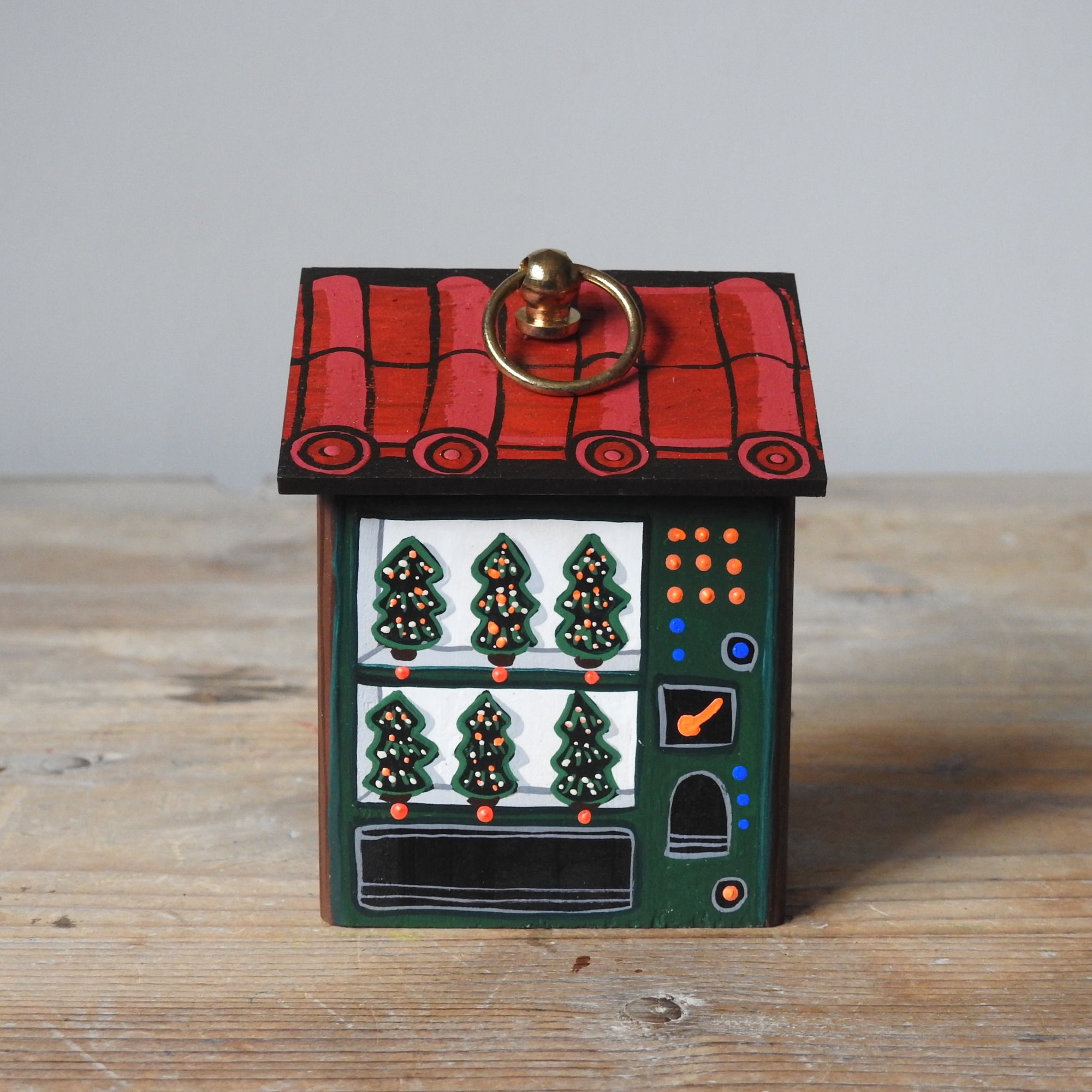 This vending machine is a festive dark green under a red tiled roof, and has six little pre-lit christmas trees inside.